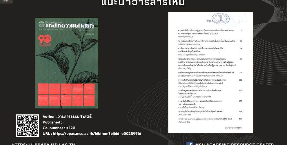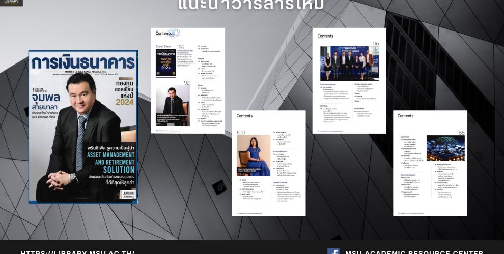 แนะนำวารสารใหม่ 16/05/2567วารสารการเงินธนาคารCallNo : ว 79ฉบับที่ 503 มีนาคม 2567Link : https://opac.msu.ac.th/bibitem?bibid=b00256085